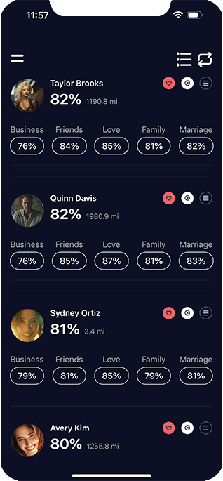 Not all relationships are the same. Compatiguru goes beyond romance by providing separate compatibility scores for love, marriage, business, friendship, and family—making it the only system truly built for every kind of connection.