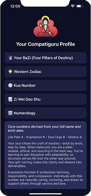 Unlock the power of the stars. Compatiguru combines Western, Chinese, BaZi, and Zi Wei Dou Shu astrology to give you insights that are deeper, broader, and more accurate than any single tradition.